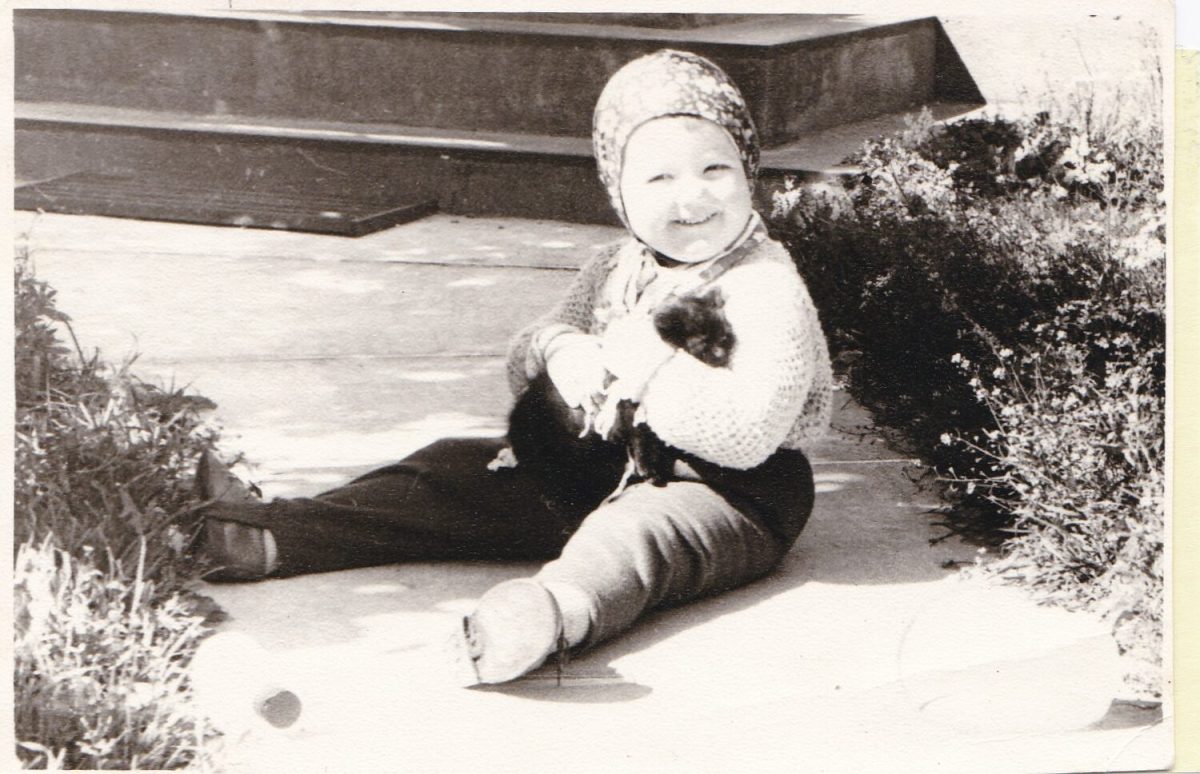 Maret vanaisa ja vanaema juures Viskoosas koos kassiga. Umbes kaheaastane.